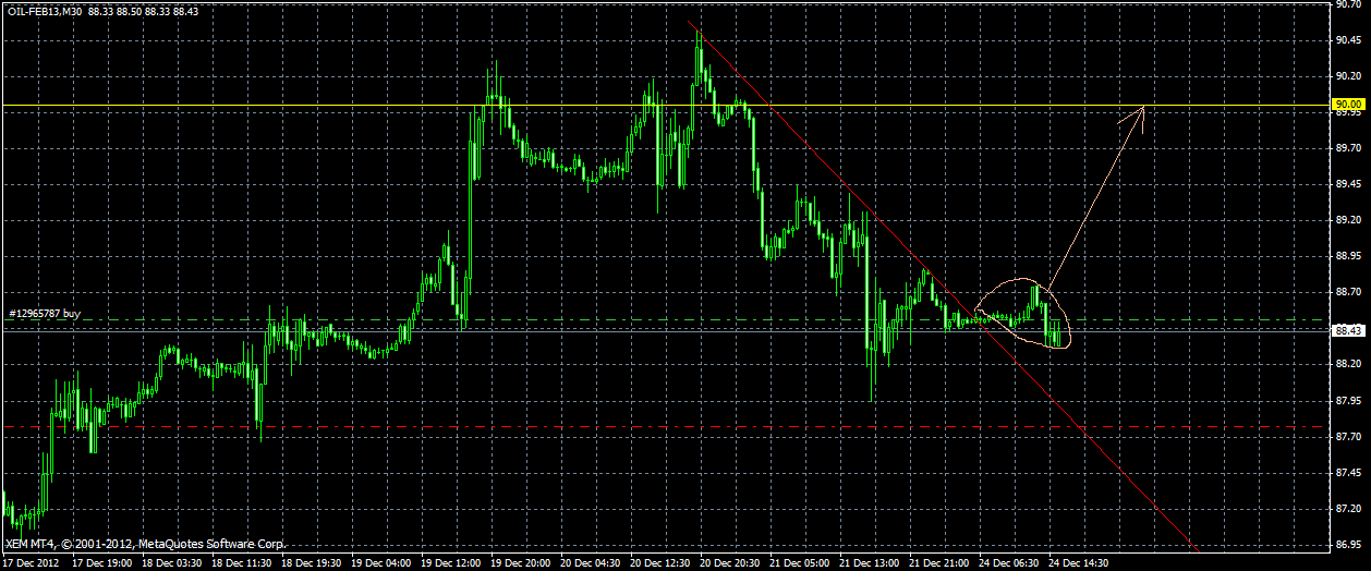 Нефть сейчас может дать отличную точку входа на покупку, цена вошла в коррекционную стадию и подошла к пробитому чуть ранее уровню ставшем теперь поддержкой 88.11 - 88.00 фигура, от него я и ожидаю возобновления основного северного тренда , стоп (и возможный переворот) чуть ниже 88.00 фигуры. ![]() | ||||||||||