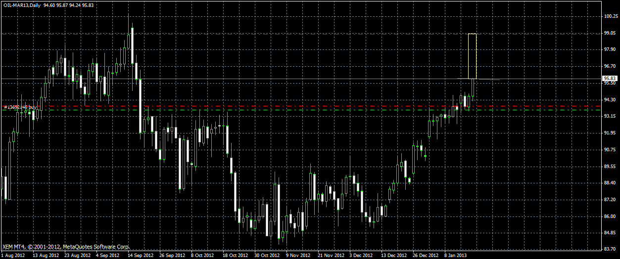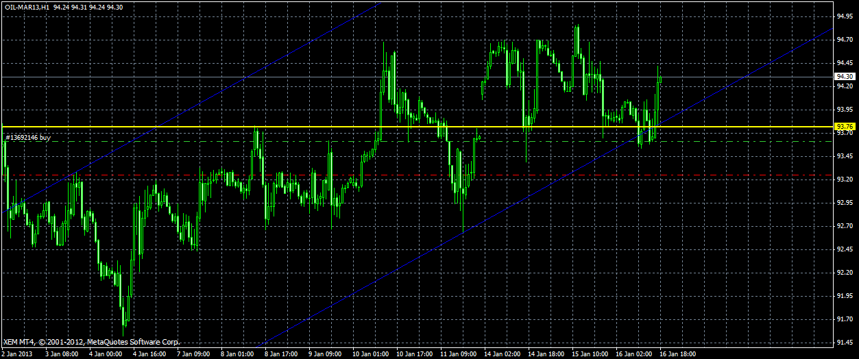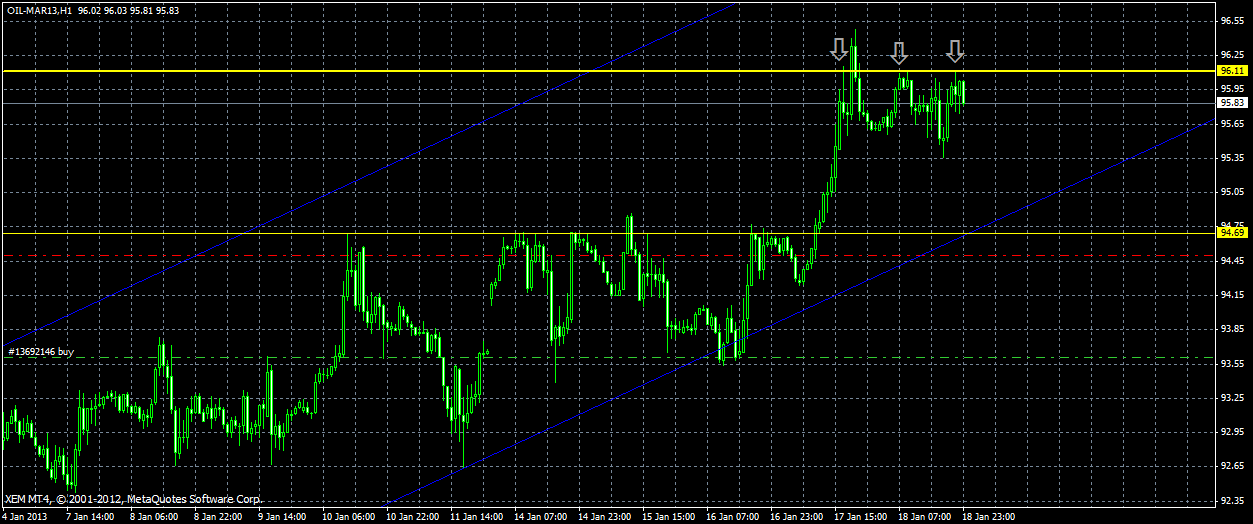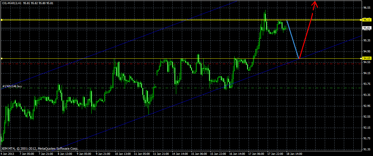 Решил только что добавить еще одну покупку по нефти, цена отлично отработала вчерашний сигнал на покупку (даже сумела без особых усилий прорвать 95.00 фигуру) и вышла на новый максимум недели после чего началась небольшая южная коррекция,сейчас заметен новый уровень поддержки 95.15 ниже которого находится моя точка выхода из всей позиции, цель пока 96.00, 96.50. ![]() | ||||