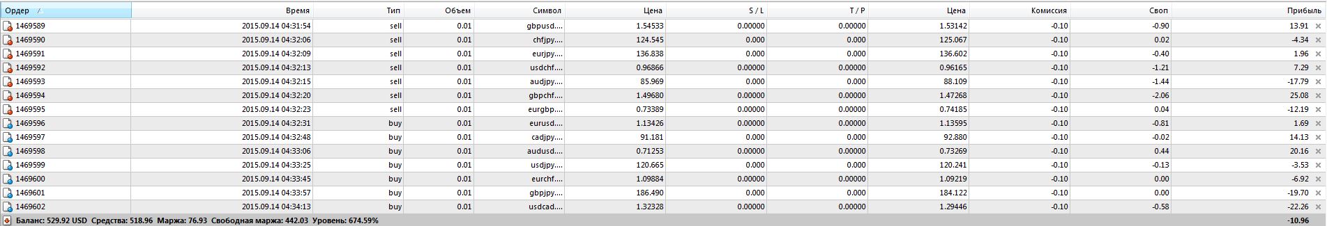 Я торгую в основном двумя валютными парами, это EURUSD и USDCHF иногда USDJPN, хватает. В разные стороны по поводу евро/дол и доллар/чиф не торгуете? Говорят на разнице можно зарабатывать. вот попробуйте, счет желательно безсвоповый, будет всю жизнь болтаться туда-сюда, не давая просадки, и не имея большой прибыли. Это Я когда-то лет 5 назад собирал пары, по пару копеек в неделю зарабатывал 1) Селл GBPUSD EURGBP GBPCHF CHFJPY AUDJPY EURJPY USDCHF 2) Бай CADJPY AUDUSD USDJPY EURUSD EURCHF GBPJPY USDCAD P.S. Не знаю как сейчас, но тогда это работало. Вот результат почти за месяц, баланс болтало в плюс/минус. Как видно, есть свопы и комиссия, но можно взять безсвоповый счет и без комиссий, но с малым спредом, так-же подобрать пары, с этих можно что-то исключить, например EURCHF - она только мешает, эти пары выбирались очень давно. Прикрепленные файлы:
