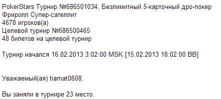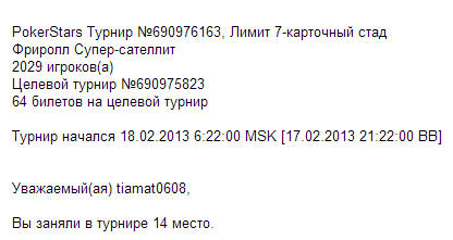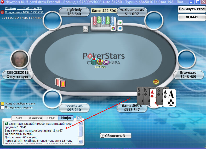 papikyo посмотрел бы я на этих заумудрявшихся на бесплатных турнирах, как они с худшей рукой выиграют. Я вчера на бесплатном турнире вылетел с тройкой королей. Пошел сразу в ан-лим, на флопе получил сет. В результате выиграл игрок с флеш: туз 7. Это что разве не фортуна? Да мало кто в ан-лим пойдет с раздачи с такой картой.
