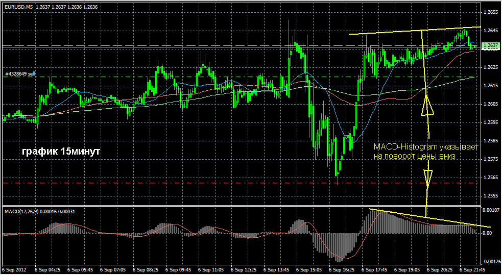 На поворот ценьі вниз указала также и MACD-Histogram графика 15минут(см. 2-ой рисунок) и также на графике 30минут. Следовательно я ожидаю снижение ценьі. Ето моё мнение.