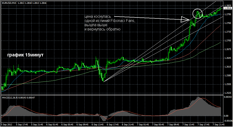 Если установить Fibonaci Fans (веяр Фибонаси) на движение ценьі вверх(см. 1-ьій рисунок), то две из них(верхная и нижняя) или даже все три должньі примерно проходить так как я нарисовал на рисунке графика 15минут. К сожелению у меня нет на терминале Fibonaci Fans и пришлось рисовать обьічньіми прямьіми линиями, но ето не проблема, главное правильно нарисовать. На рисунке чётко видно, как вверху цена подошла к одной из fan, коснулась её, потом вернувшись обратно опять пошла вверх, вьішла вьіше той же линии веяра Фибонаси и вернулась обратно. Ето свидетельствует о том, что цена достигла важного сопротивления Фибонаси и будет возвращаться обратно. Так проводится технический анализ, когда цена свободно подьімается вверх не имея других сопротивлений.
