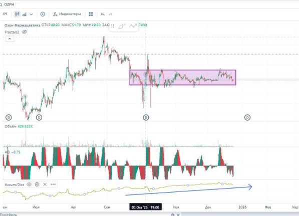 В фазе консолидации, когда цена движется в узком диапазоне, A/D особенно эффективен. Например, в случае с акциями Ozon Pharma (OZPH) можно наблюдать, как цена стоит на месте, а линия A/D уверенно растёт. Это классический признак тихого накопления перед новым импульсом.