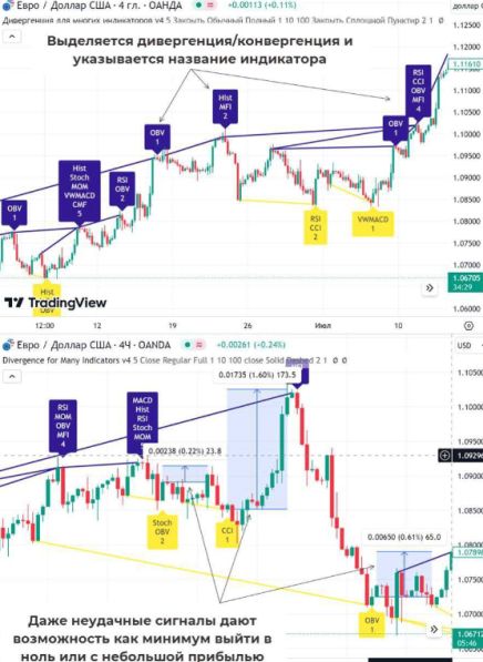 Инструмент Divergence for Many Indicators автоматически сканирует график и выявляет дивергенции сразу по семи ключевым индикаторам:
