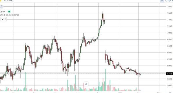 На текущий момент котировки Циан консолидируются вблизи отметки 570 рублей за акцию. Этот уровень приобретает особое значение в контексте развития медвежьего тренда, который сформировался ещё 12 декабря 2025 года. За прошедшие недели инструмент продемонстрировал последовательное снижение, что указывает на сохраняющееся давление со стороны продавцов на фондовом рынке.