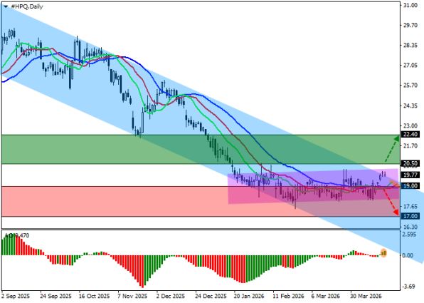 Акции HP торгуются у 20.00 долларов. Основной сценарий — BUY STOP выше 20.50 с целью 22.40. Альтернатива — SELL STOP ниже 19.00.