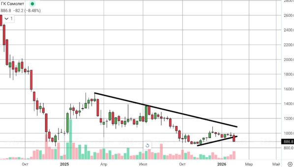 Акции ГК Самолет продолжают демонстрировать высокую волатильность на фоне сложной ситуации в строительной отрасли. По состоянию на 5 февраля 2026 года котировки SMLT консолидируются вблизи отметки 880 рублей, после резкого снижения на 8,47% накануне. Это движение привело к обновлению январского минимума и пробою нижней границы восходящего тренда, который формировался с ноября 2025 года от уровня 839,60 руб. за акцию.