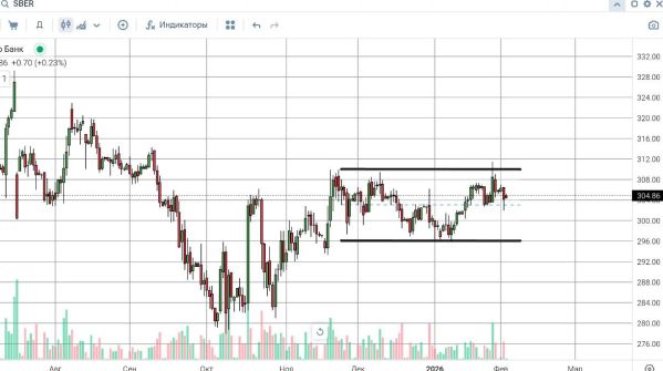 В январе 2026 года обыкновенные акции Сбербанка прибавили примерно 1,9%, что позволило инструменту вновь подойти к верхней границе устоявшегося диапазона 297–310 рублей. Этот горизонтальный канал сформировался ещё во второй половине ноября 2025 года и с тех пор определяет основную траекторию движения.