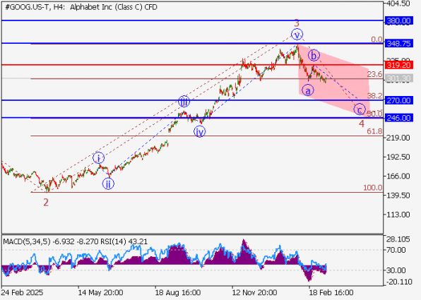 Акции Alphabet Inc. сохраняют долгосрочный восходящий потенциал, однако в краткосрочной перспективе на рынке развивается коррекционная структура. Пока цена находится ниже уровня 319.20, более вероятным остаётся сценарий снижения к диапазону 270–246.