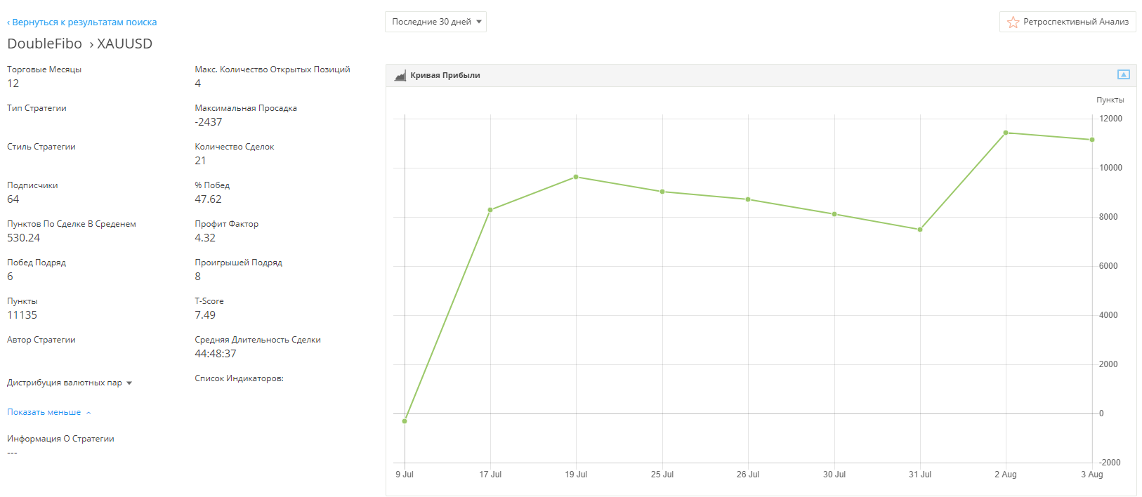 Следующая по прибыльности стратегия называется DoubleFibo, основным стилем которой стал трейдинг по тренду. В количественном соотношении, прибыль данной стратегии меньшее, но по-прежнему ошеломляющее количество пунктов. Всего было проведено 21 сделки, где 10 оказались прибыльными, однако небольшой рост стоимости золота в последнюю декаду июня и нацеленность стратегии на среднесрочную перспективу вывели стратегию на второе место. T-score стратегии равен 7.49. Подписчиками данной стратегии стали 64 человека, что делает ее одной из самых популярных в нашем рейтинге.