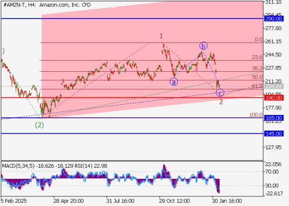 На четырёхчасовом таймфрейме формируется первая волна младшего уровня 1 of (3), а локальная нисходящая фаза воспринимается как коррекционная волна 2 of (3). Внутри неё подходит к завершению участок c of 2, после окончания которого ожидается возобновление восходящего импульса с целью движения цены в диапазон 290.00–320.00 за акцию Amazon.