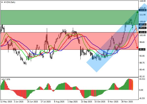 Ключевые ценовые ориентиры для акций Volkswagen AG на текущем участке рынка сосредоточены в диапазоне 95.10–114.00. Базовыми поддержками выступают уровни 95.10 и 103.00, где ранее формировались значимые развороты и усиливался спрос на актив. Сопротивлениями остаются зоны 110.20, 112.00 и 114.00, пробой которых будет указывать на развитие следующей волны роста.