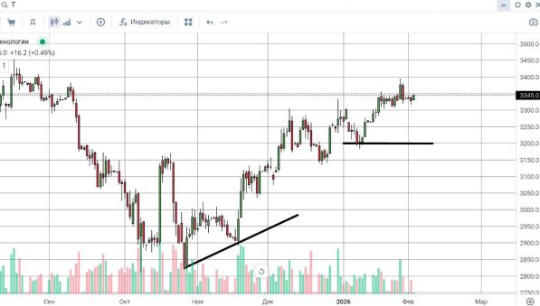 Ближайшее сопротивление по акциям Т‑Технологии расположено в зоне 3395–3400 рублей: именно здесь в конце января и начале февраля активизировались продавцы, что привело к остановке роста и локальному откату. Данный диапазон выступает краткосрочным барьером для продолжения восходящего тренда, и его уверенный пробой станет сигналом к развитию движения к новым максимумам. В качестве сильной поддержки по-прежнему рассматривается уровень 3200 рублей за акцию, от которого ранее уже происходили отскоки покупателей. Пока цена удерживается выше 3200, базовый сценарий остается бычьим, а любые краткосрочные просадки воспринимаются как техническая коррекция в рамках глобального роста. Формирование диапазона 3200–3400 рублей создает удобный коридор для работы как для консервативных инвесторов, так и для активных трейдеров.