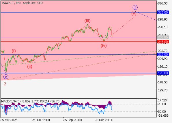 На четырёхчасовом таймфрейме продолжается формирование первой волны младшего уровня i of 3, где завершается структура волны (v) of i. Это означает, что рынок может войти в краткосрочную коррекцию после завершения текущего импульса, но общая восходящая тенденция при этом сохранится до тех пор, пока цена удерживается выше ключевой поддержки 245.00. Такой сценарий создаёт возможности как для агрессивных трейдеров, работающих по тренду, так и для более консервативных участников, ожидающих откатов к сильным зонам спроса.