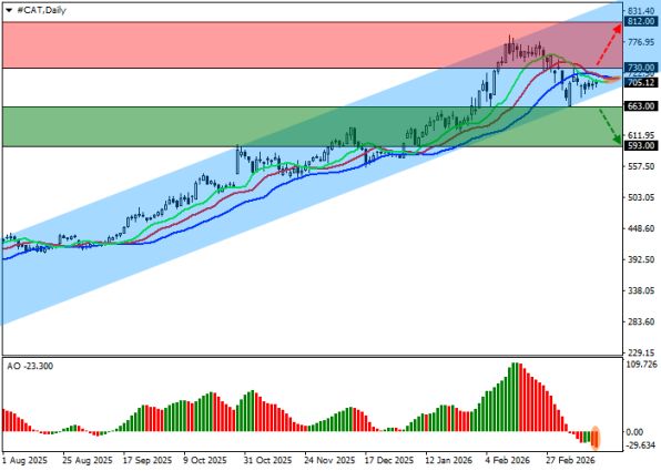 Акции Caterpillar Inc., мирового лидера в производстве строительной и горнодобывающей техники, завершили предыдущую сессию на отметке 705.00. Для инвесторов, которые ищут выбор стратегии инвестиций, текущая техническая картина предлагает два четких сценария. Разбираем уровни, индикаторы и точки входа на ближайшие дни.