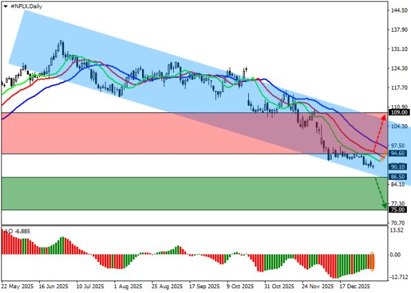 Акции Netflix Inc., лидера в сфере стриминговых сервисов и производства контента, продолжают испытывать давление, торгуясь на отметке около 90 долларов. Перспективы роста остаются слабыми из-за конкуренции и неопределённости с приобретениями. Компания активно борется за подразделение WBD Streaming & Studios, отделяющееся от Warner Bros Discovery Inc., с оценкой в 65 млрд долларов. Список претендентов сократился до двух: Netflix и Paramount Skydance Corp. Последняя предложила 108,4 млрд долларов, что выше 82,7 млрд от Netflix. Разница в структуре сделок — 30 долларов на акцию против 27,75 — может сыграть роль, но личные связи руководства Netflix дают преимущество.
