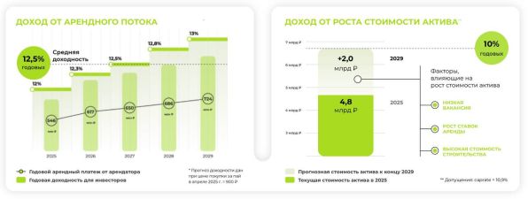Заявленная целевая доходность — 12,5% годовых от аренды плюс 10% от роста стоимости пая. На горизонте 5 лет ожидается суммарно 22,5% годовых. Фонд может расширяться за счет приобретения новых корпусов на той же площадке, что повысит капитализацию. Для инвесторов это значит не только пассивный доход, но и капитальный прирост в сегменте, где спрос на склады для интернет-торговли растет на 15–20% ежегодно.