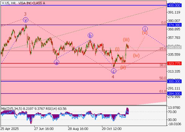 Если цена акций Visa закрепится ниже уровня 323.77, базовый бычий сценарий будет отменён, а приоритет сместится в пользу нисходящего движения. В этом случае торговый инструмент получает потенциал для развития снижения в район 300.00–284.00, где расположены следующие значимые уровни поддержки и возможного появления крупного спроса.