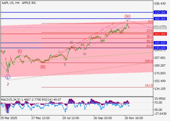 Альтернативный сценарий для акций Apple реализуется, если цена уверенно пробивает вниз и закрепляется ниже зоны ключевой поддержки около 263 долларов. В этом случае усиливается вероятность более глубокой коррекции в направлении следующих важных уровней — в диапазон 230–245 долларов за акцию.