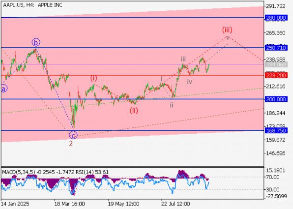 На текущий момент развивается начальная часть этой волны — i of 3, включающая в себя подволну (iii) of i, которая демонстрирует признаки ускорения. При сохранении текущей динамики цена может достичь зоны 250.71–280.00 долларов.