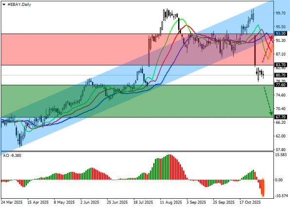 На 07 ноября 2025 года акции eBay Inc. (тикер: EBAY) торгуются на отметке 80,00 USD. Компания — один из ведущих игроков глобального онлайн-ритейла — продолжает оставаться в фокусе инвесторов, однако текущая рыночная динамика требует осторожного подхода. Технический анализ указывает на вероятное продолжение нисходящего тренда, но при этом сохраняются условия для потенциального отскока.