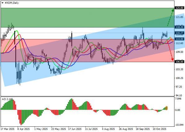 На дневном графике цена акций ExxonMobil находится ниже верхней границы восходящего канала с динамическими уровнями 123.00–110.00. Это указывает на временное ослабление бычьего импульса, но не отменяет среднесрочного потенциала роста при условии удержания ключевых уровней поддержки.