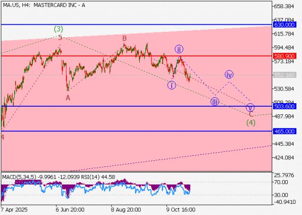 Инвесторы, следящие за динамикой бумаг платежного гиганта MasterCard Inc. (MA), оказались в зоне повышенного внимания. На момент анализа, 05 ноября 2025 года, акции демонстрируют отчетливую коррекцию после продолжительного восходящего тренда. В рамках волнового анализа Эллиотта текущая ситуация интерпретируется как развитие четвертой волны (4), следующей за завершенной импульсной волной (3). Внутри этой коррекции формируется волна C, которая, в свою очередь, находится на стадии волны iii. Эта техническая картина указывает на высокую вероятность продолжения нисходящего движения в ближайшей перспективе.