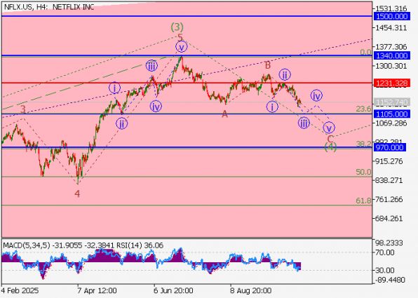 На дневном графике акций Netflix Inc. (NFLX) завершилась восходящая третья волна старшего уровня (3), и сейчас формируется коррекционная четвёртая волна (4). В её структуре уже завершены волны A и B, а активно развивается волна C, внутри которой идёт построение третьей подволны iii.