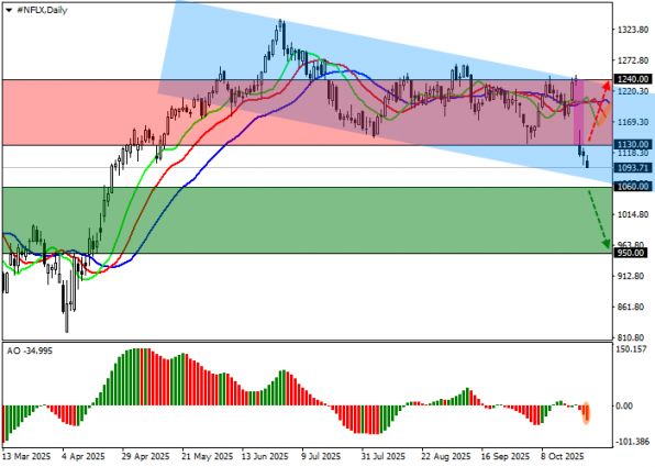На момент анализа цена акции Netflix Inc находится на уровне 1090.00. На дневном графике наблюдается приближение к нижней границе нисходящего канала с динамическими границами 1200.00–1000.00. Это зона, где исторически происходили развороты или ускорения движения, что делает её критически важной для принятия решений.