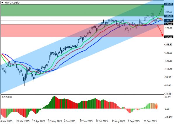 На 20 октября акции Nvidia торгуются около 182,00, находясь в коррекционной фазе внутри восходящего канала с границами 174,00–210,00.