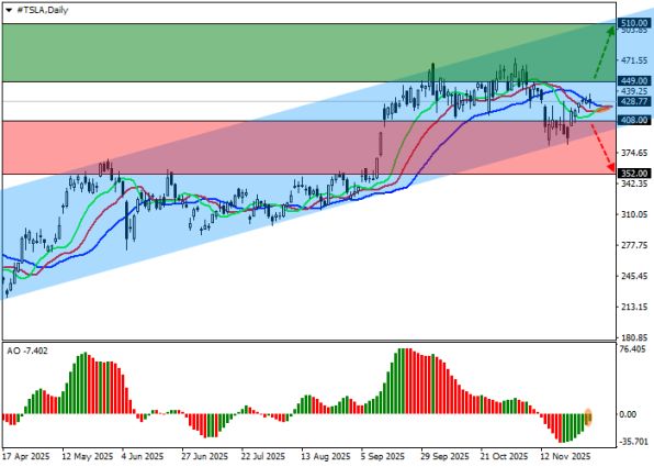 На дневном графике акции Tesla формируют восходящий канал с динамическими границами: верхняя — на отметке 510.00, нижняя — около 400.00. Текущая цена (429.00) располагается ближе к нижней границе канала, что указывает на потенциал для отскока.