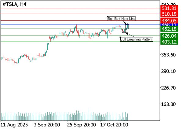 Дополнительно в диапазоне 452.18–468.11 USD можно выделить повторяющийся паттерн «бычий захват за пояс», который свидетельствует о неудачных попытках «медведей» перехватить контроль над ценой. Эти сигналы в совокупности формируют устойчивый восходящий тренд, направленный к ближайшему уровню сопротивления 484.05 USD.