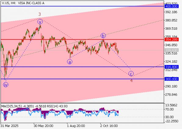 На основе дневного графика акций Visa можно выделить развитие третьей волны старшего временного цикла — волны (3). В рамках этой волны уже завершилась подволна 3 of (3), после чего началась коррекционная фаза — волна 4 of (3). На данный момент рынок находится в процессе формирования внутренней структуры этой коррекции, а именно — волны c of 4.
