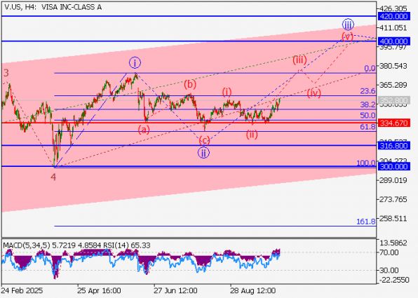Технический анализ акций Visa Inc. (V) по состоянию на 8 октября 2025 года выявляет многообещающую картину для покупателей. На дневном таймфрейме актив завершил коррекционную фазу и вступает в ключевую стадию роста — формирование импульсной волны (iii) в рамках более крупной восходящей структуры.