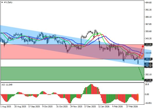 Акции Visa Inc. остаются в фокусе инвесторов благодаря лидерству в платёжных технологиях и стабильному инвестиционному доходу от комиссий. На дневном графике цена движется вдоль линии поддержки нисходящего канала. На четырёхчасовом таймфрейме сохраняется риск снижения при закреплении ниже локального минимума, но уверенный пробой сопротивления способен быстро вернуть бычий импульс и открыть путь к новым максимумам.