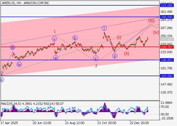 На четырёхчасовом таймфрейме продолжается формирование третьей волны младшего уровня 3 of (3), а также подволны iii of 3, что указывает на преобладание бычьих настроений среди участников рынка. В рамках этого сценария ожидается, что цена акций Amazon сможет подняться в зону 290.00–315.00, где находится значимая область потенциальной фиксации прибыли по среднесрочным длинным позициям.