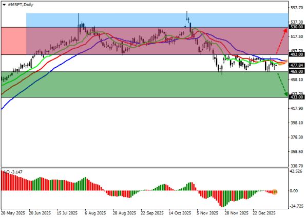 Технический анализ акций Microsoft на 13 января 2026 года показывает, что цена тестирует важную отметку 478.00, оставаясь между ближайшими уровнями 469.00 и 490.00. Удержание цены выше 469.00 поддерживает сценарий продолжительной консолидации, а пробой этой зоны вниз может запустить более глубокую коррекцию к прошлогодним минимумам.