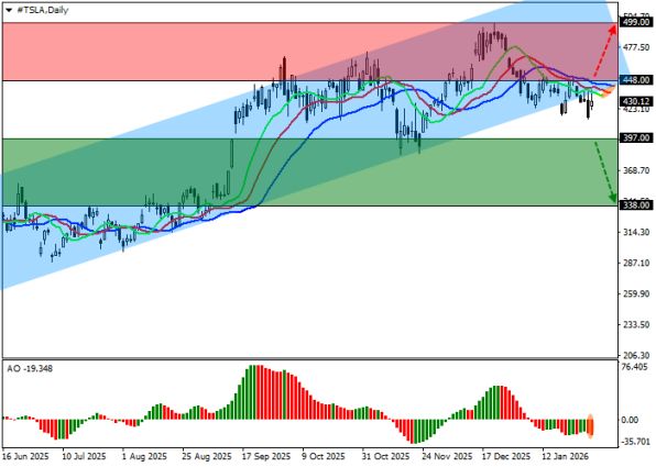 На фоне снижения интереса к рисковым активам и охлаждения сегмента электромобилей бумаги Tesla Inc. консолидируются в районе 430.00, оставаясь ниже ключевых динамических уровней сопротивления. На дневном графике цена закрепилась под нижней границей восходящего канала с ориентировочными диапазонами 530.00–435.00, что указывает на формирование среднесрочной коррекции после затяжного роста.