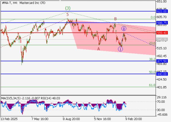 На закрытие 10 февраля 2026 цена акций Mastercard составила $540.39 (+0.95% за день). С пика 2025–2026 годов (~$601.77) котировки просели на 10–12%, формируя коррекционную волну. По волновой теории Эллиотта наблюдается развитие второй волны (2) после импульса (1), с подволной С в составе (2). На 4-часовом таймфрейме завершилась ii of C, идет построение iii of C — это усиливает вероятность дальнейшего снижения.