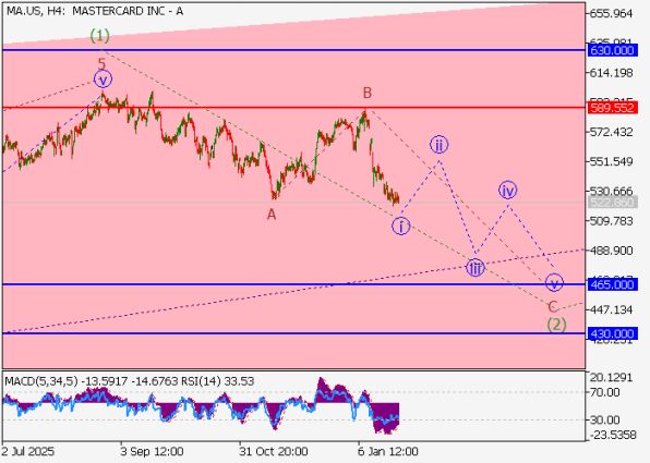 Для торговли по акциям Mastercard на дату 28.01.2026 выделяются следующие ключевые ценовые уровни: 430.00, 465.00, 589.55, 630.00 и 670.00, которые формируют основную архитектуру поддержек и сопротивлений в текущей рыночной структуре. Зона 430.00–465.00 рассматривается как целевая область для нисходящей волны C of (2), где возможно формирование устойчивого локального дна и переход к новому росту.