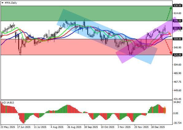Акции Mastercard Inc., одной из крупнейших мировых платёжных систем, торгуются в районе 582.00 USD, оставаясь в рамках устойчивого восходящего тренда. На дневном графике котировки движутся вдоль верхней границы восходящего ценового канала с ориентировочными динамическими границами 560.00–600.00, что указывает на высокую вероятность продолжения роста. Ближайшей значимой зоной сопротивления остаётся диапазон около 598.00–600.00, пробой которого откроет дорогу в сторону следующей цели 630.00.