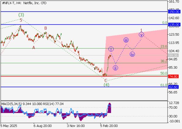 На дневном графике акций Netflix формируется восходящая третья волна старшего уровня (3) of C, после завершения коррекции в виде четвёртой волны (4) of C рынок перешёл к построению пятой волны (5) of C. На четырёхчасовом таймфрейме развивается первая волна младшего уровня 1 of (5), внутри которой уже сформирована импульсная волна i of 1, а рынок отрабатывает локальную коррекцию в формате ii of 1.
