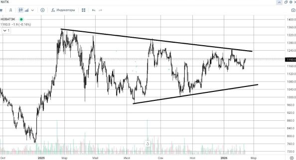 На 16 февраля 2026 года акции НОВАТЭК (тикер #NVTK) консолидируются вблизи отметки 1195 рублей, демонстрируя признаки восстановления после коррекции января. Инструмент прошёл важный тест на прочность у исторического уровня поддержки 1140–1141 рублей — зоны, неоднократно подтверждавшей свою значимость с декабря 2025 года. Именно отсюда на прошлой неделе началось восходящее движение, наметившее потенциал для возврата к январским максимумам.