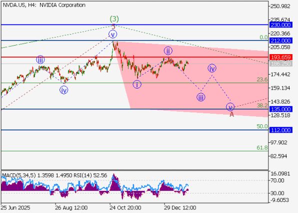 На дневном графике акций Nvidia завершилось формирование третьей импульсной волны старшего уровня (3), после чего цена перешла в фазу нисходящей коррекции в формате четвёртой волны (4) по методологии волнового анализа. На четырёхчасовом таймфрейме развивается волна A of (4), внутри которой завершилась коррекционная вторая волна младшего порядка ii of A, и сейчас формируется третья волна iii of A, традиционно сопровождающаяся повышением динамики движения.