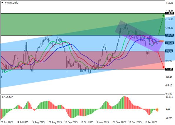 Инвесторам в акции Volkswagen AG важно учитывать текущую техническую картину: по инструменту сохраняется умеренно восходящий сигнал, но рынок по‑прежнему чувствителен к уровням 105.00 и 98.80, что задаёт рамки для торговых стратегий.