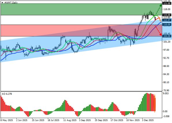 Для долгосрочных и среднесрочных инвесторов акции Walmart остаются инструментом с умеренным риском и устойчивым фундаментальным профилем, однако точки входа целесообразно искать с опорой на технические уровни 110.00–115.00. Для активных трейдеров на ближайшую неделю можно выделить два базовых сценария — покупку по пробою локального сопротивления и продажу по пробою поддержки, с чётко заданными уровнями стоп-лосса и тейк-профита.