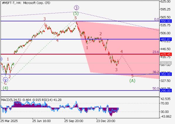 На дневном таймфрейме завершилась третья импульсная волна старшего уровня (3), и теперь формируется нисходящая коррекция как четвертая волна (4). На четырехчасовом графике развивается волна (A) внутри (4), где уже отработала третья подволна 3 of (A), за которой следует коррекция 4 of (A). Если сценарий подтвердится, цена акций Microsoft ускорит падение к зоне 352.00–290.00, с критическим стоп-лоссом на 425.45.