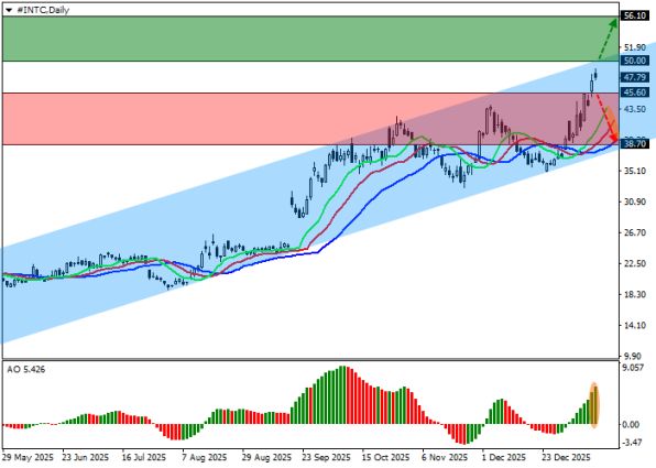 Технические индикаторы подтверждают бычий настрой: EMA на "Аллигаторе" расширяется вверх, быстрые средние выше сигнальной линии, а гистограмма AO формирует бары над нулевой отметкой. Это указывает на устойчивый импульс, но перекупленность может спровоцировать откат. Для заработка на акциях Intel учитывайте глобальные тренды: рост AI повышает спрос на чипы, но конкуренция от TSMC и Samsung давит на маржу.