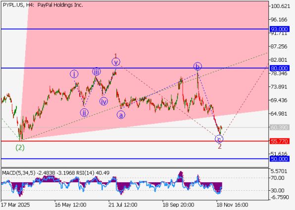 Данная конфигурация создает благоприятную почву для реализации основного сценария. Если текущая разметка верна, то цена акций PayPal имеет все шансы на существенный рост в целевой коридор $80.00 – $93.00. Важно подчеркнуть, что любая торговая стратегия должна включать строгое управление рисками. Для данного случая критическим уровнем, «отменяющим» бычий сценарий, является отметка $55.77. Закрепление котировок ниже этой точки говорит о сломе текущей тенденции.