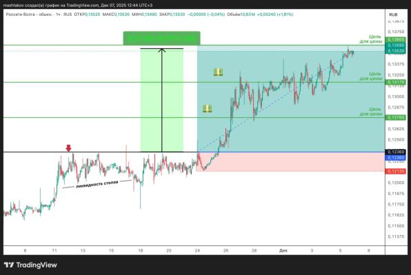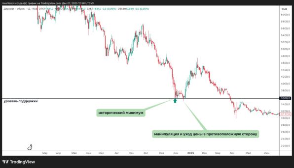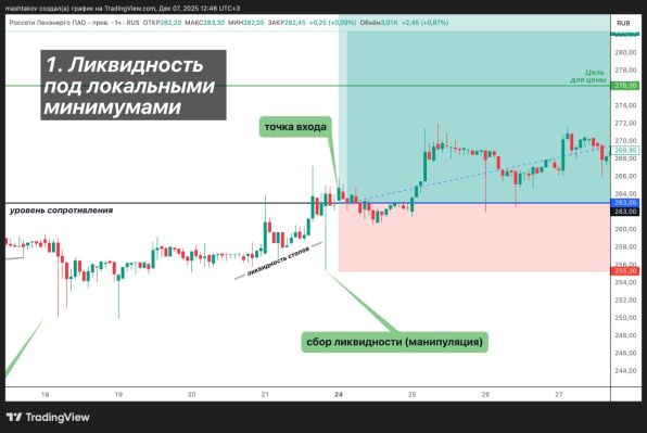 Перед резким ростом цена может сделать импульсный пробой локального минимума с длинной теневой свечой, которую затем быстро откупают. Такая манипуляция заставляет мелких трейдеров фиксировать убытки, в то время как крупный капитал аккумулирует ликвидность для дальнейшего движения вверх.